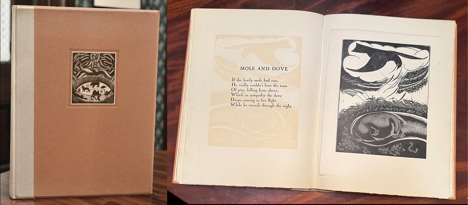 The front cover was perfectly stamped. The relief of the wreath was invitingly palpable. The construction of the binding was immaculate. Even the placement of the title on the narrow spine was just right. Internally, all of the tipping-in of the original linocuts was faultless. Nor could I find fault with the printing of any page in any book.