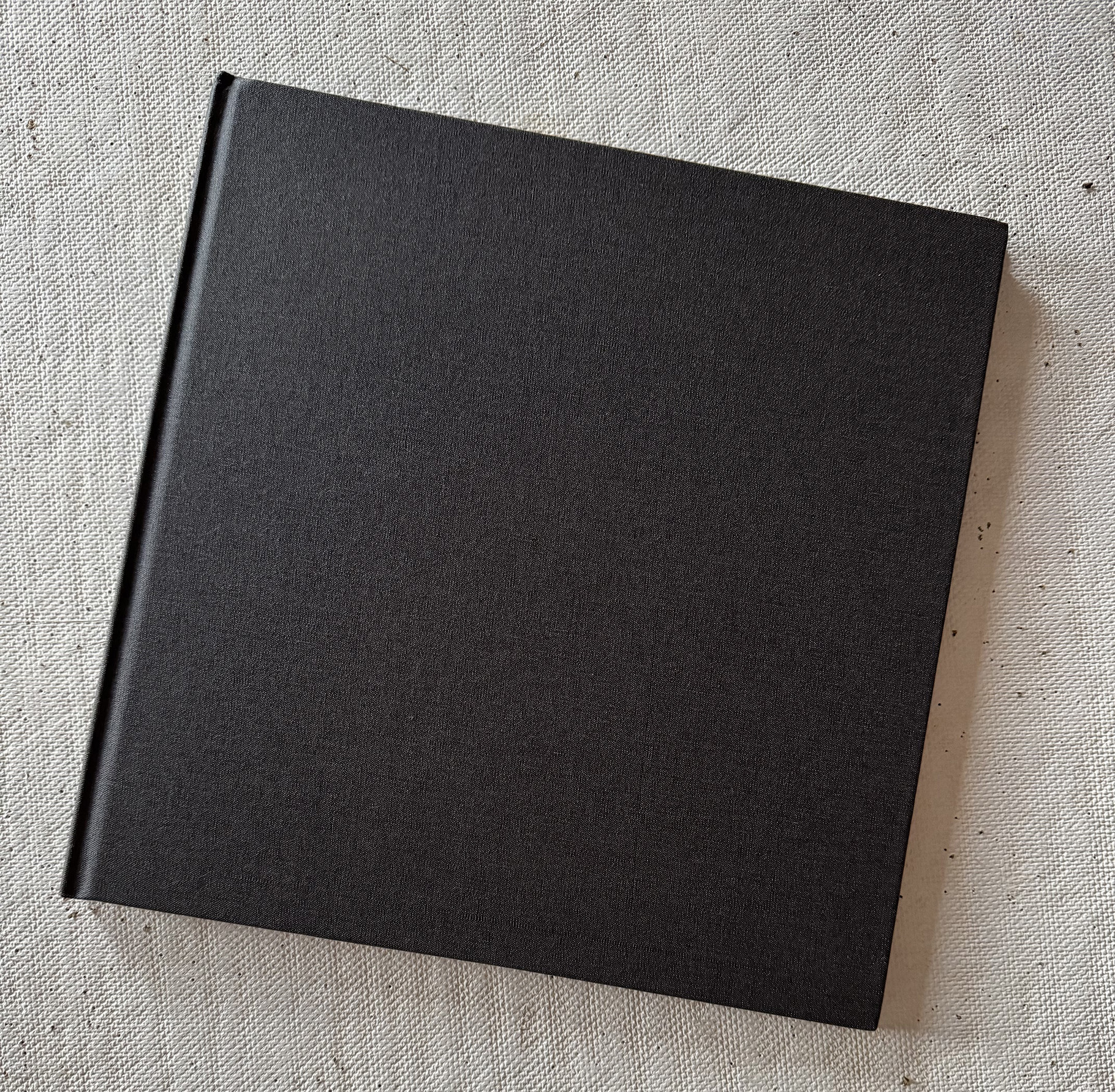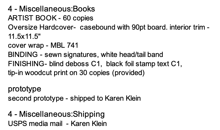 Going through the options on the BookArt website, Karen and I settled on an edition of 60 books, half with tipped-in original linocuts, half without. The number was derived by the 15 being the number of different linocuts: 60 being 4 times 15. The size became 11.5″ x 11.5″ as that’s the largest Smart at BookArt could offer. The books would be hardbound in linen-like cover wrap. (The itemization shown here lists “MBL 421” as our cover wrap choice, but the surprise behind it I’ll touch on later.) The bindings would be sewn, and the covers would be stamped (debossed) both in black and without color (blind deboss). Both Klein and I would receive a bound prototype for our inspection.