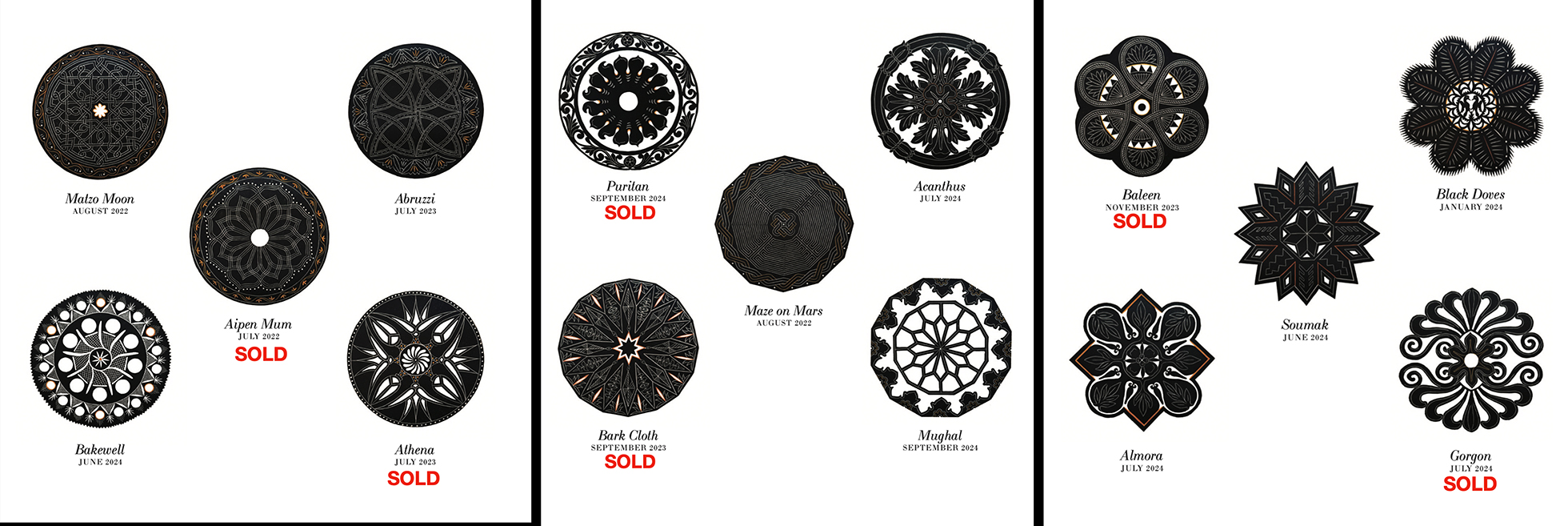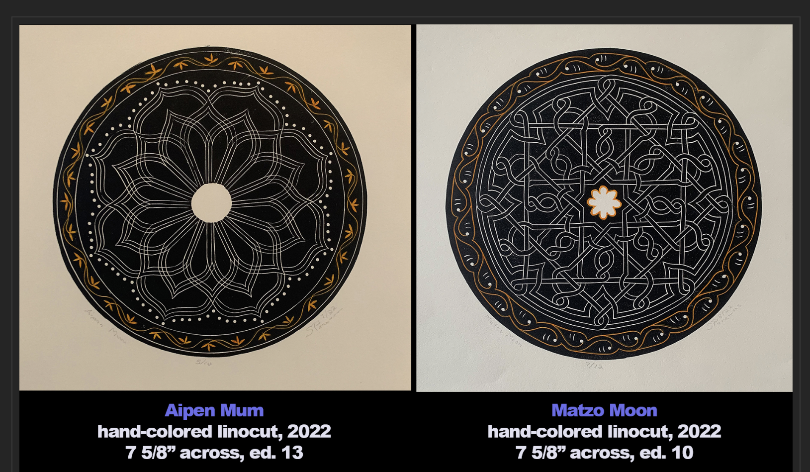 These two were the first ones. “Aipen Mum” celebrated by my 2016 artist residency in the northern India state of Uttarakhand, where I was introduced to the Aipen folk arts tradition. “Matzo Moon” referenced an illuminated miniature in the 14th-century Golden Haggadah manuscript in the British Library.