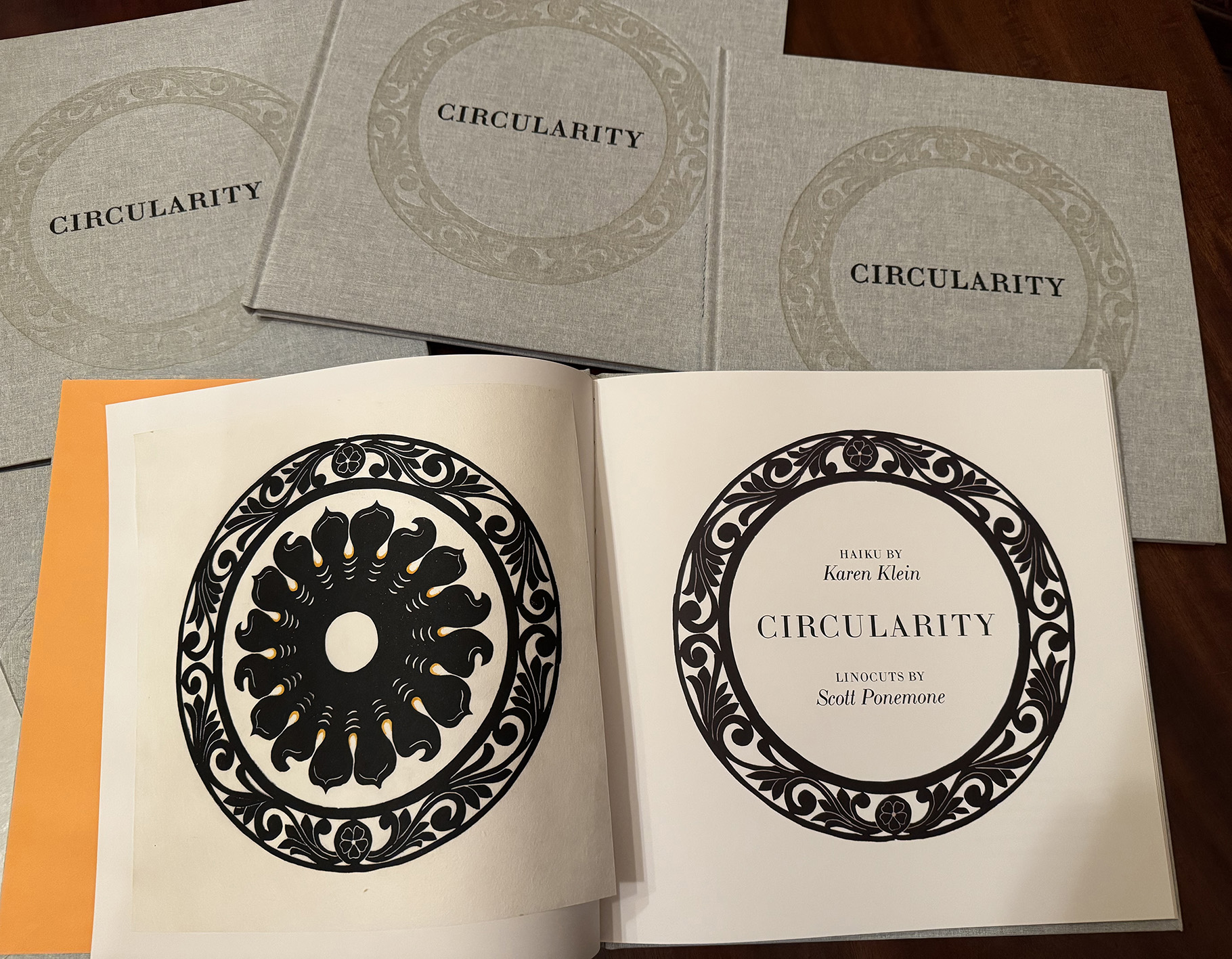 I can’t pin down the date, but during a three-way Zoom session between Nicole Clark, Karen Klein and myself, Clark asked if we had a title. I admitted I hadn’t given it any thought; however, Klein, who had been thinking of our pairings of haiku and linocuts as embodying a celestial cycle, was quick with the word “circularity.” I said “yes” tentatively but never offered an alternative. So Circularity it became.
