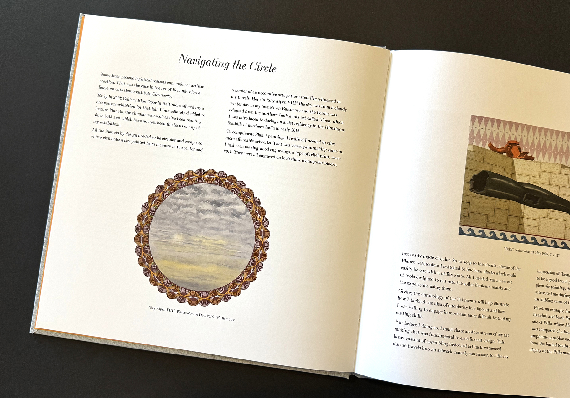 And I must also applaud Nicole Clark’s design. First off her decision to use the Bodoni type. My only request to her was to select a serif font because I wanted an elegant traditional look. She couldn’t have chosen better. As to the haiku/linocut spreads, she centered the lines of the haiku and used Bodoni italic. Plus the size of the type was carefully chosen so that the poem had a just enough weight to hold its own opposite the linocut. Even her layouts of the essay pages, as in the start of “Navigating the Circle,” were elegant and invitingly readable.