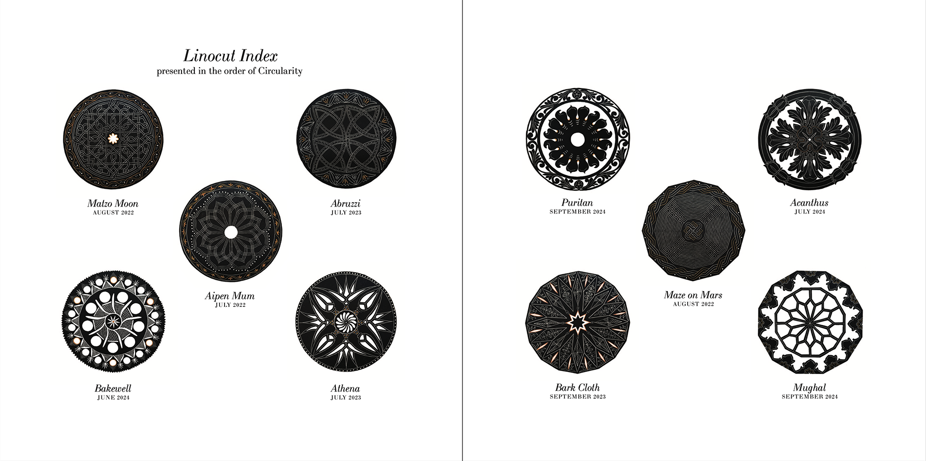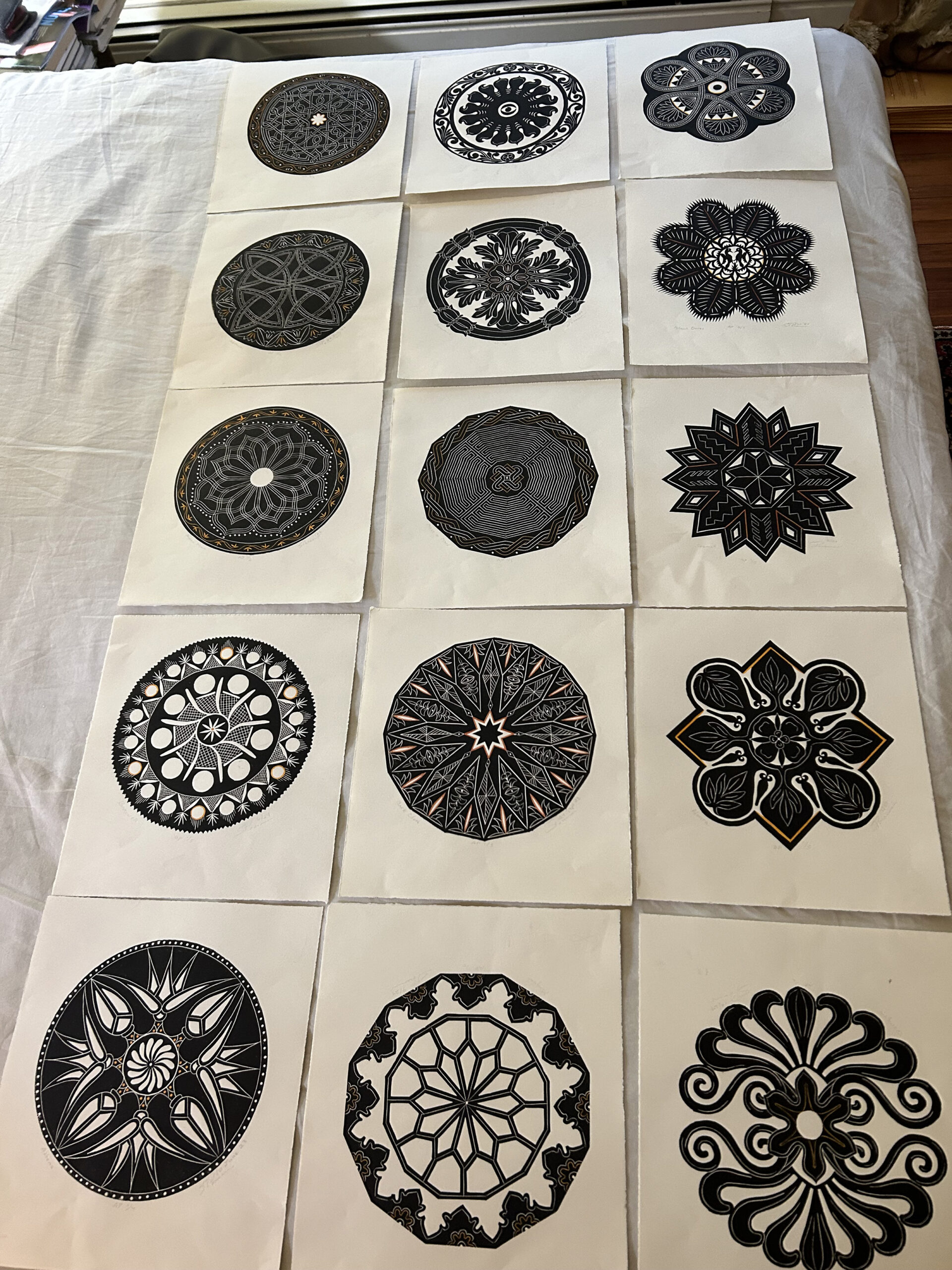 On Oct. 22 she sent me a photo of all 15 linocut proofs I had sent her on her bed to show me the sequence she selected and wrote: “My aesthetic organizing principle is to follow what happens to your essentially circular patterns, how you break and reframe the outer edges while containing an overall circularity with variations. A privilege to work with them. They’re a model of imagination with the discipline of superb craftsmanship which reflects the demands of the artistic form you have chosen in this sequence.”
