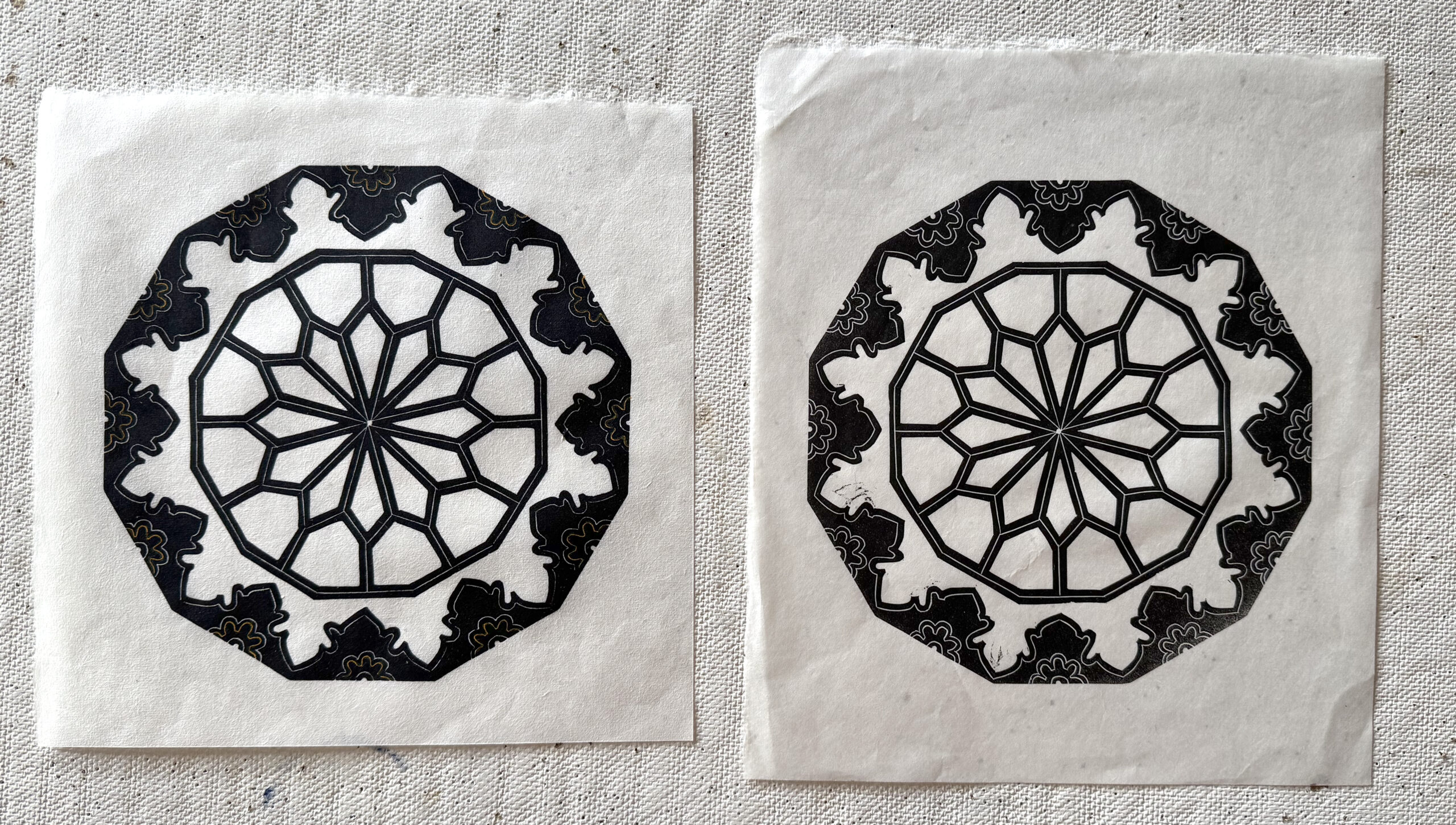 Here’s a comparison. On the right is a proof of Almora that I printed in July 2024 on RIVES paper. On the left Almora on Sekishu. I placed them on black paper to show how translucent Sekishu is. Both were printed by hand (using a baren, a disc-like printing tool, and a spoon) with Speedball brand’s “supergraphic black” ink.  The orange areas I highlighted with watercolor.