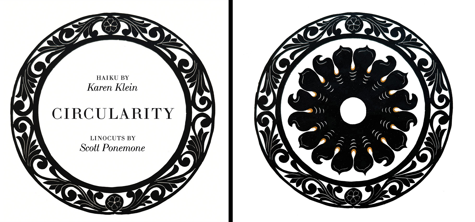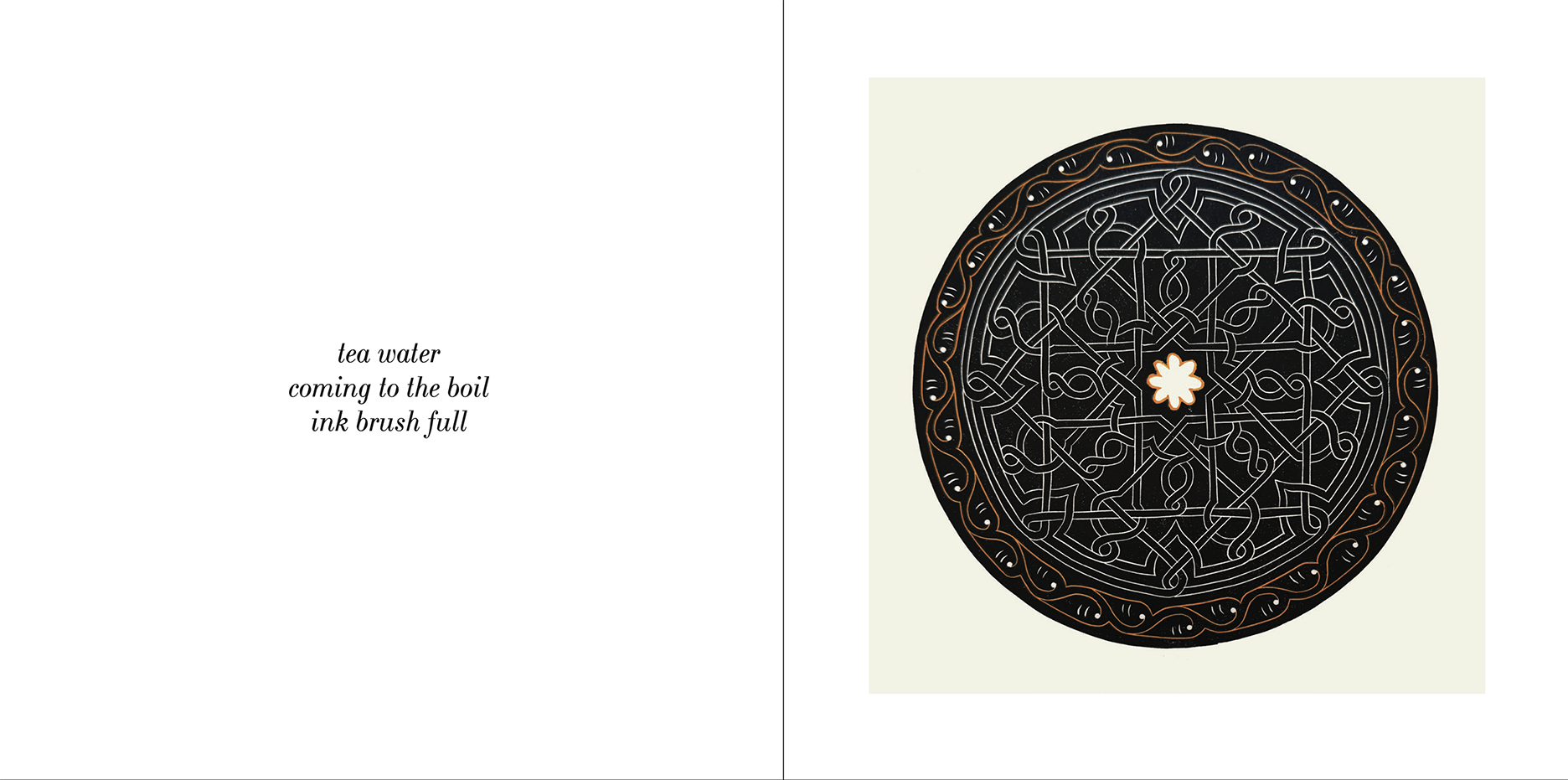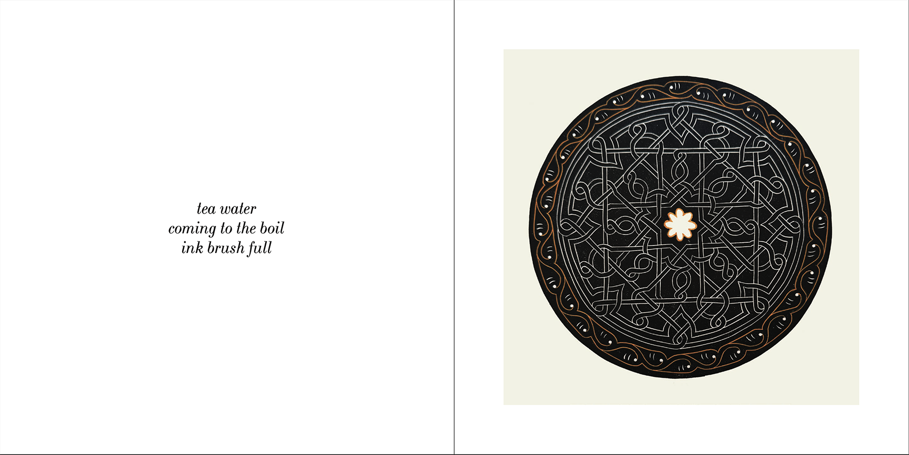 Of course each reader will come to their own conclusion. I encourage a slow reading of the fifteen haiku/linocut spreads. Think about the oscillation of the cycle winter solstice to winter solstice. Think about the spiritual thoughts within each of mandala-shaped linocuts. And think about the difference of how thought is communicated by word and by image.