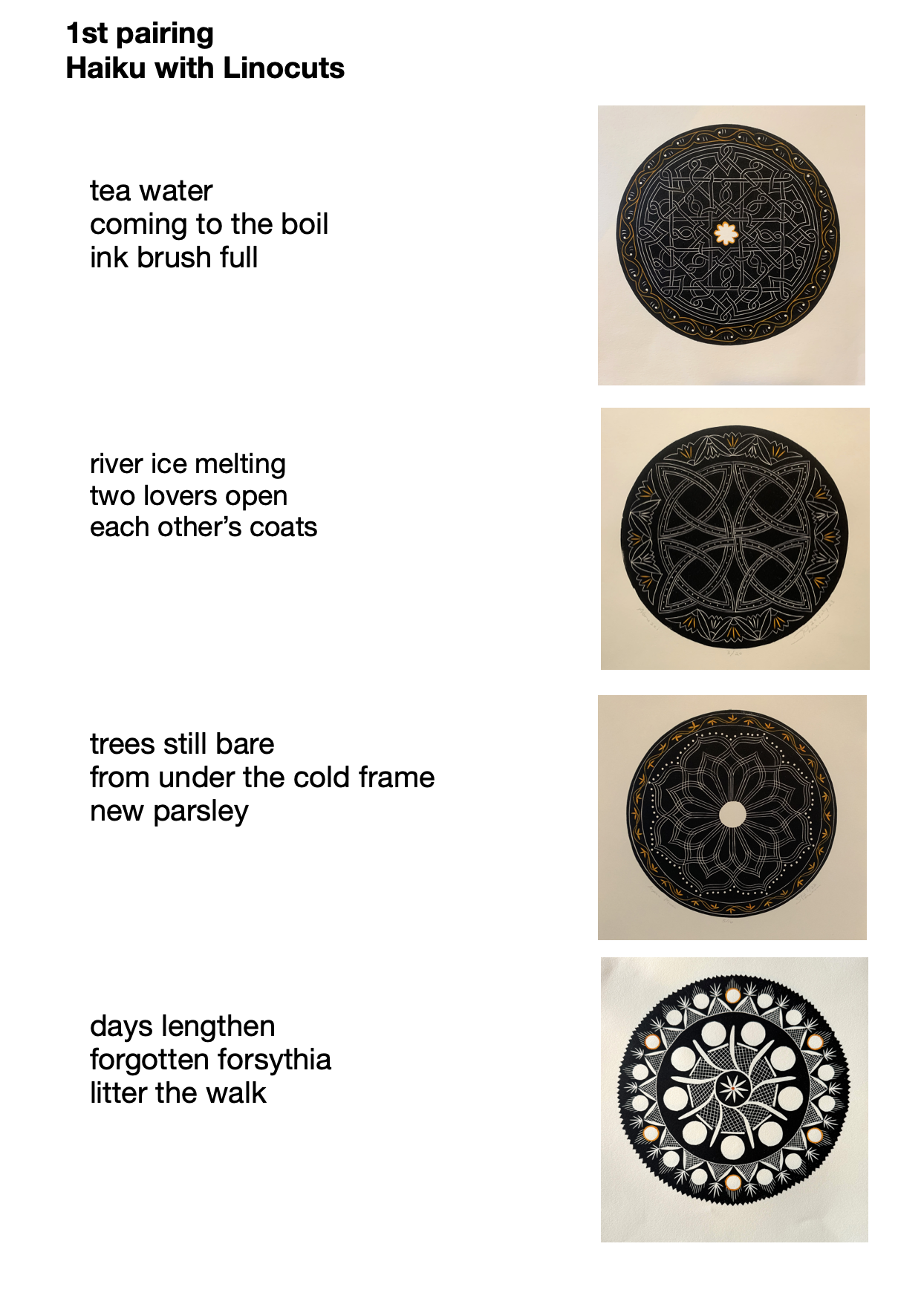 This is the first page of three showing my pairing of Klein’s haiku with my linocuts