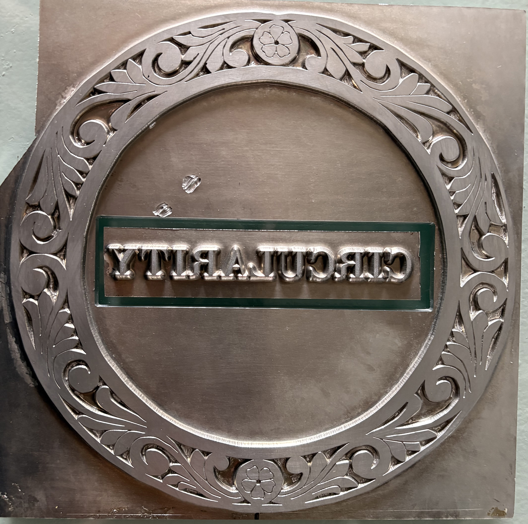 This is the stamp that was created for the cover of Circularity. Notice how the title had to be made separately and positioned within the wreath.