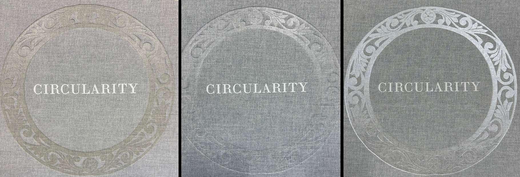 Three photos of foils for the wreath on the cover of “Circularity.” (L to R) 1–”smoke” clear foil, 2–standard clear, and 3–”pearl” clear. (BookArt photos)